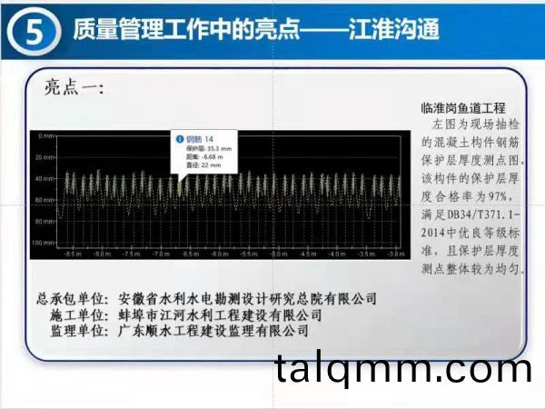 8月17日,引江濟淮集(ji)糰公司(si)召開8月份質量安全視(shi)頻會,會上,蚌埠江河公司承建的臨淮崗魚道工程混凝土鋼筋保護層作爲亮點(dian)在視頻會(hui)上交流。